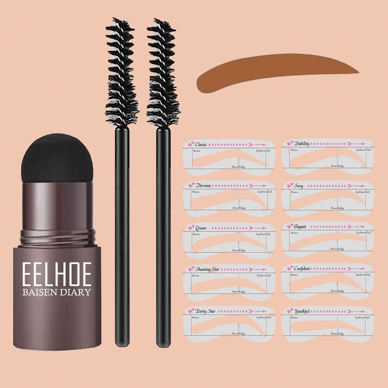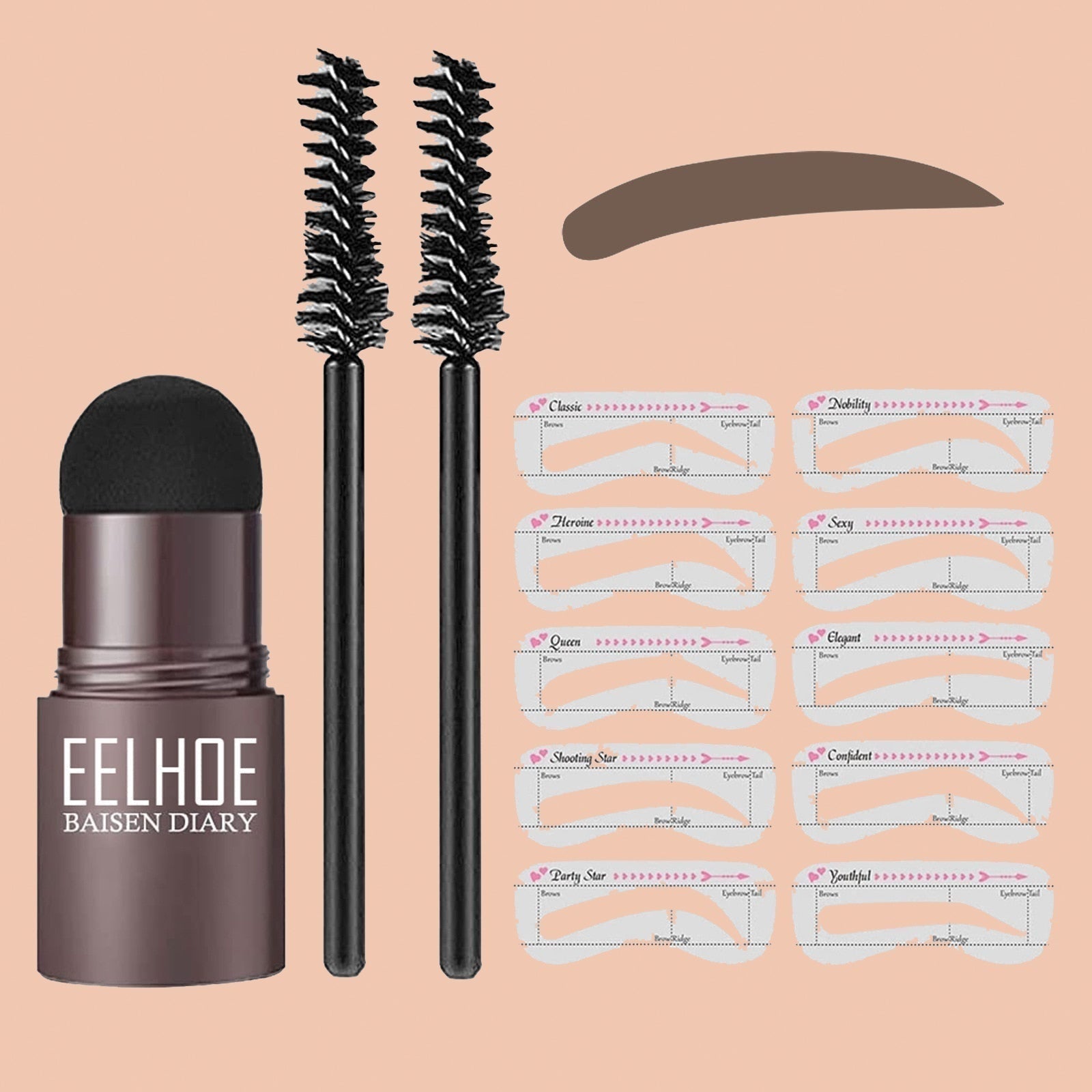 Sisältää 10 erilaista kulmamuotoa, 2 harjaa ja kulmakarvaleimasimen. Voit valita kulmakarvojesi muodon ja värin itse!