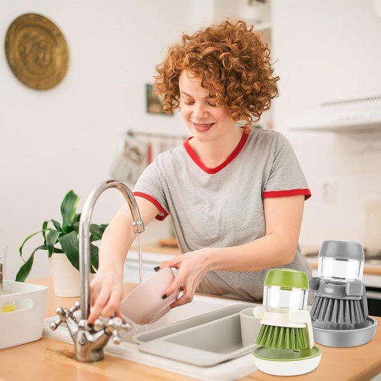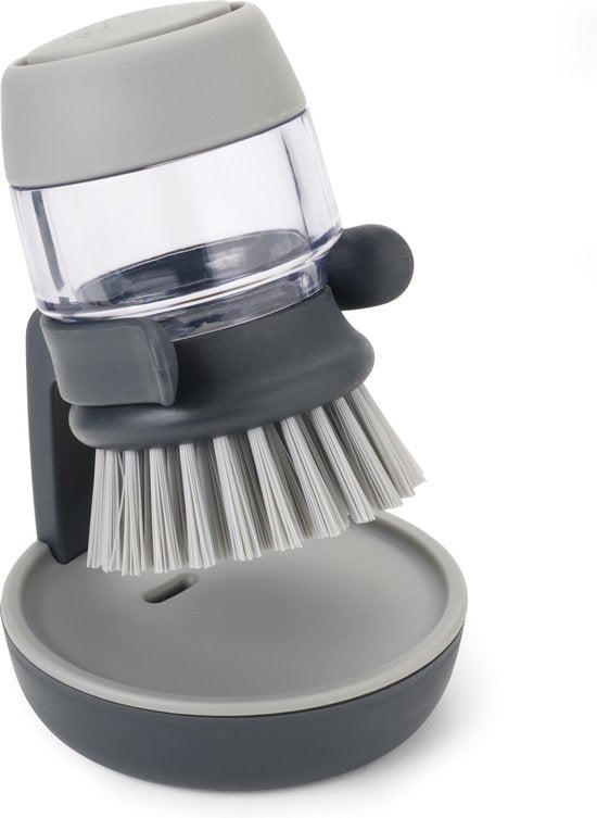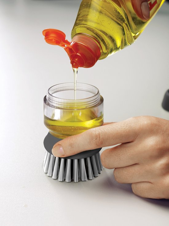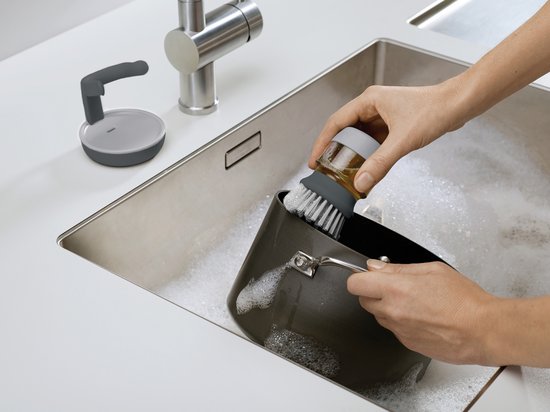 Käytännöllinen muotoilu: Helppo huuhdella, ei tartu käsiin ja on hellävarainen iholle. Mukana kätevä säilytysalusta, joka pitää tiskipöytäsi siistinä.