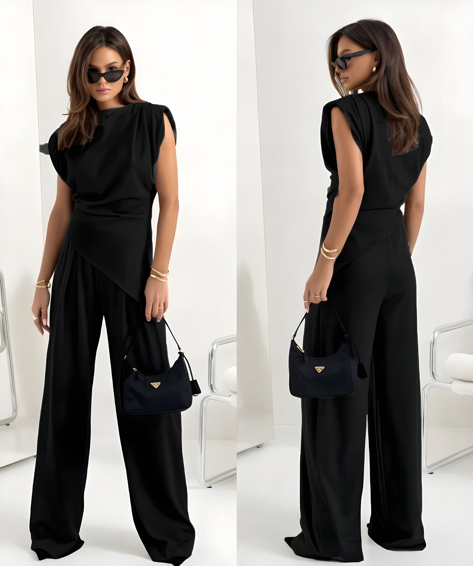 Kuvittele itsesi Makea kaksiosaisessa setissä, täydellinen tasapaino minimalismista ja vaivattomasta eleganssista. Olitpa sitten kaupungilla, illanvietossa tai jollain juhlalla, tämä setti antaa sinulle itseluottamuksen ja tyylin tunteen. Elegantti topin ainutlaatuinen epäsymmetrinen leikkaus ja valuvat, korkea vyötäröiset housut tekevät tästä asusteesta todellisen statementin. Lisää korkokengät saadaksesi hienostuneen ilmeen tai valitse tennarit saadaksesi täydellisen rento-chic tunnelman.