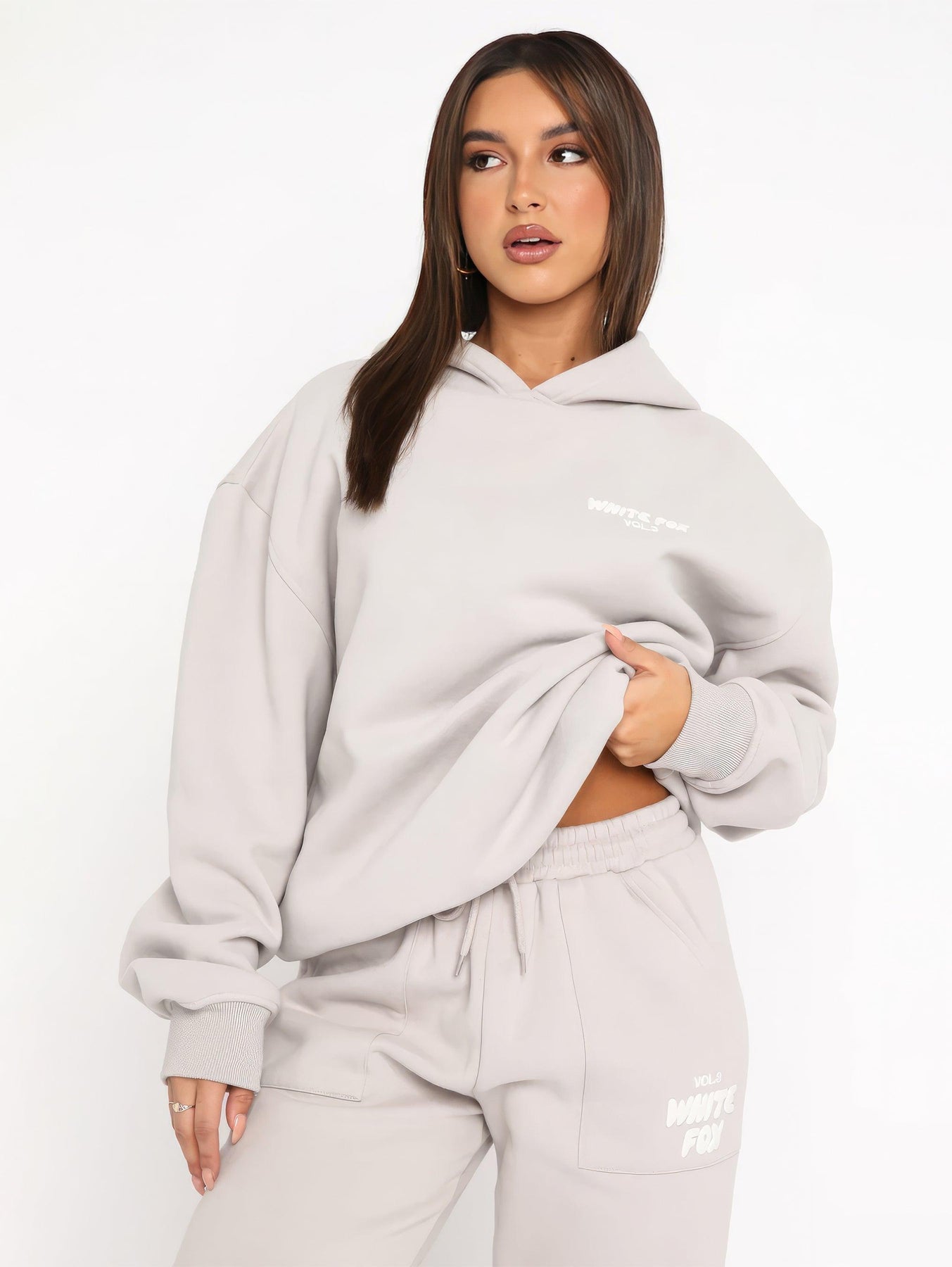 Whitefoxin treenipuku on täydellinen yhdistelmä mukavuutta ja tyyliä! 😍 Tämä oversized-treenipuku tarjoaa rennon istuvuuden joustavilla ribbausresoreilla hihoissa ja helmassa, mukavan hupparin sekä on valmistettu pehmeästä fleece-kankaasta. 🧥✨ Keskellä oleva puffer-merkki lisää ainutlaatuisen yksityiskohdan ja antaa vaivattoman vapaa-ajan ilmeen. 🌟