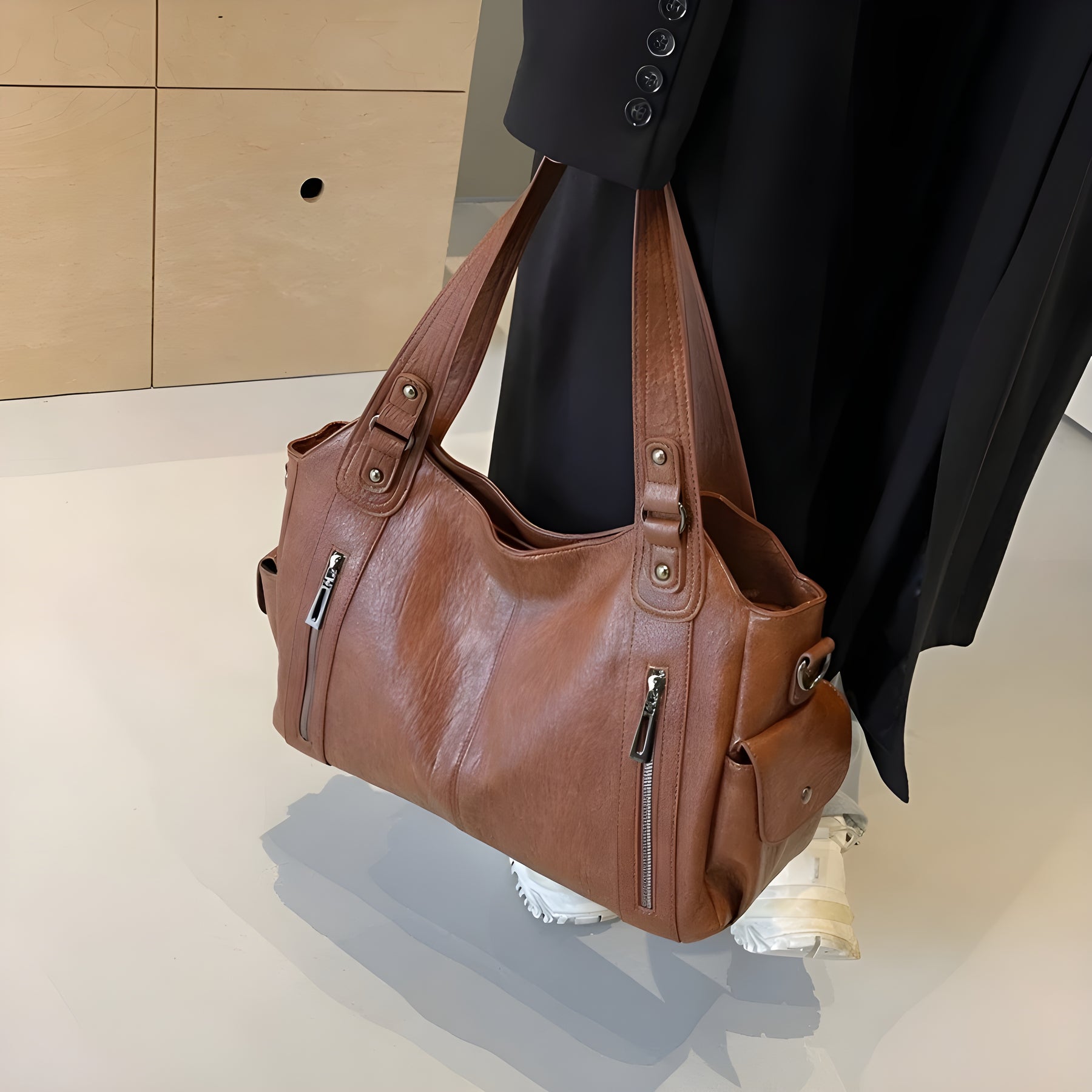 Mila Olkalaukku ei ole pelkkä laukku; se on tyylikäs statement-osa, joka tarjoaa käytännöllistä mukavuutta tinkimättä muodista. Täydellinen kiireisiin päiviin, jolloin haluat kantaa mukanasi kaiken, aina kannettavasta tietokoneesta lempihuulipunaan ja puhelimeen, ilman että se tuntuu raskaalta tai kömpelöltä. Pehmeästä, vegaanisesta nahasta valmistettu laukku, jossa on trendikkäitä metallisia yksityiskohtia, antaa asullesi juuri sen lisäflairin.
